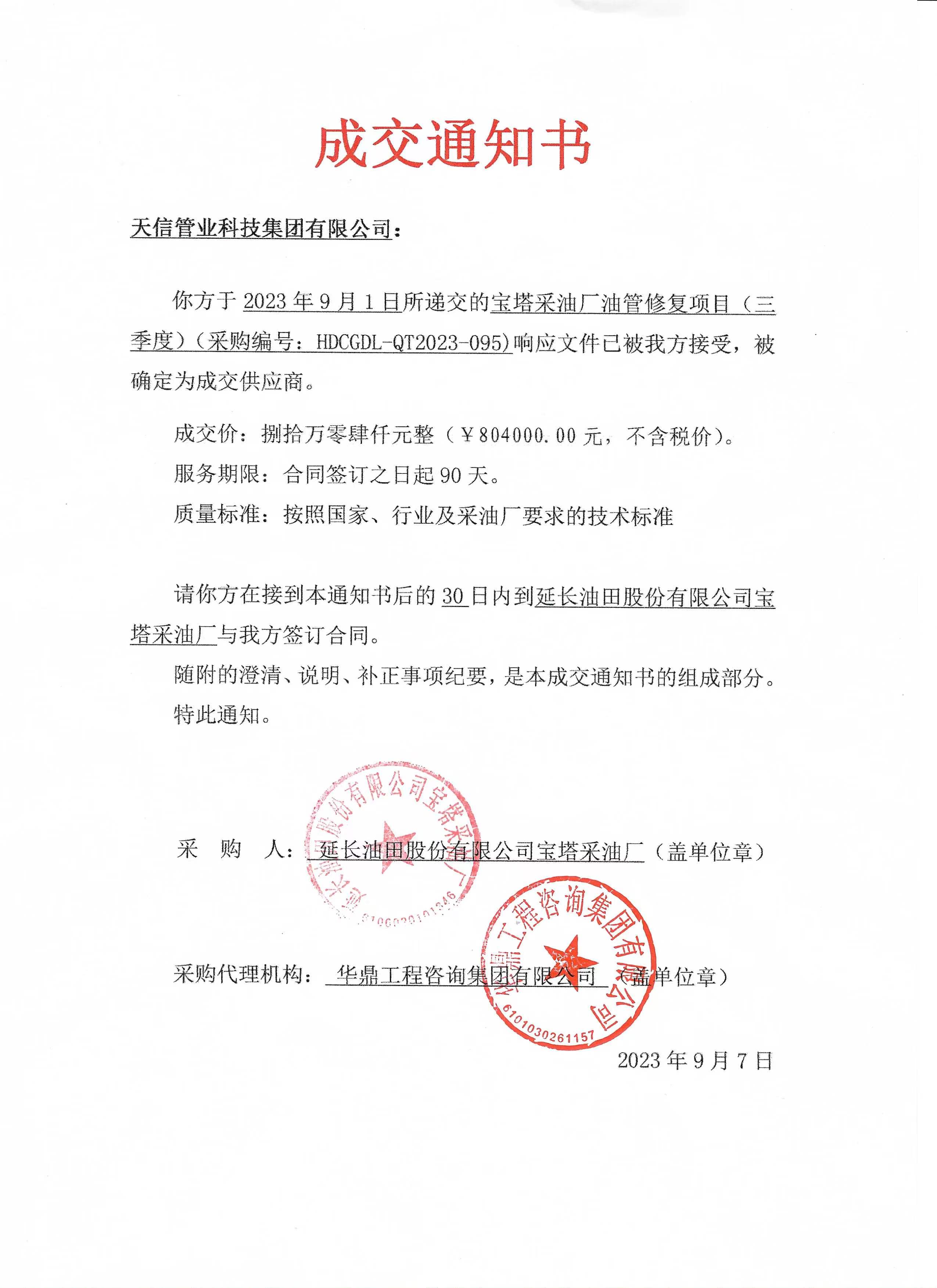 你方于2023年9月1日所遞交的寶塔采油廠(chǎng)油管修復(fù)項(xiàng)目(三季度)(采購(gòu)編號(hào):HDCGDL-QT2023-095)響應(yīng)文件已被我方接受,被確定為成交供應(yīng)商。
